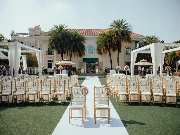 Most venues include luxury furnishings, private parking, outdoor spaces, staging areas, and premium finishes. Additional services such as catering, décor, entertainment, and valet can be arranged.
